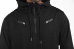 بلوفر بغطاء رأس وأربطة قماشية قابلة للتعديل مصنوع من نسيج ناعم يمنحك شعور بالراحة والدفء في آن واحد, يتميز بياقة مرتفعة وسحاب معدني كامل من الأمام وخط مضلع في كلا الجانبين وبخط مثلث بارز من الخلف ، مزين بطبعة رمادية مضيئة أعلى الصدر والأكمام و ينتهي بجيوب أمامية بسحاب جانبي أنيق. اللون أسود