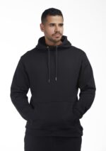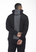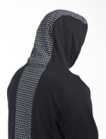 بلوفر برقبة مرتفعة وغطاء رأس بخطوط مضلعة متصلة بإربطة قماشية مزينة بدبوس معدني لامع، يتميز بمظهر كبير الحجم وجيبان أمامية مخفية واسعة مزينة بسحابين جانبية و طبعة مستوحاه من شماغ الشياكة باللون الأبيض من الخلف لتكتمل أناقتك . اللون أسود
