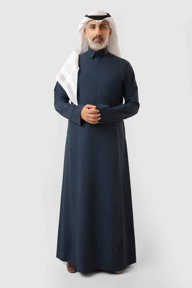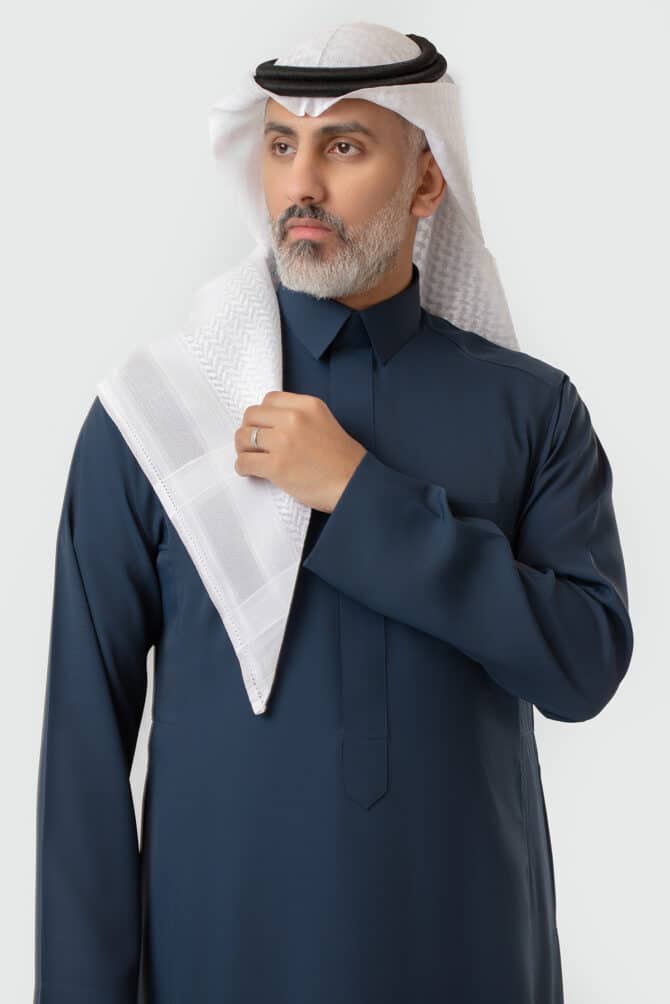 ثوب رجالي مصنوع من خامة السميراميس التي تتميز بالنعومة والإنسيابية والمظهر العصري الأنيق.