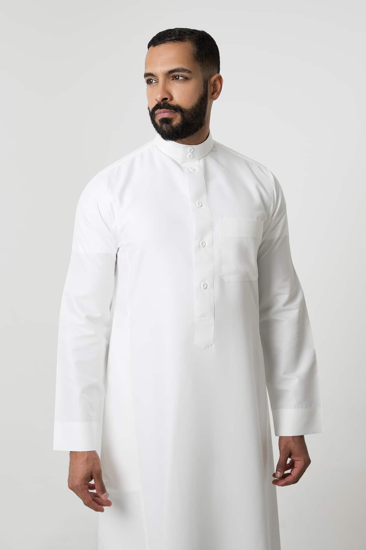 ثوب كلاسيك سادة مصنوع من قماش بوليستر 100% بملمس حريري, ثوب خفيف الوزن يتميز ببساطة تفاصيله الأنيقة بياقة دائرية,جبزور مثلث الشكل و أزرار أمامية ظاهرة, أكمام سادة مرتبة.