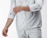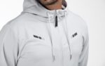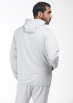 بلوفر بغطاء رأس وأربطة قماشية قابلة للتعديل مصنوع من نسيج ناعم يمنحك شعور بالراحة والدفء في آن واحد, يتميز بياقة مرتفعة وسحاب معدني كامل من الأمام وخط مضلع في كلا الجانبين وبخط مثلث بارز من الخلف ، مزين بطبعة رمادية مضيئة أعلى الصدر والأكمام و ينتهي بجيوب أمامية بسحاب جانبي أنيق. اللون رمادي فاتح