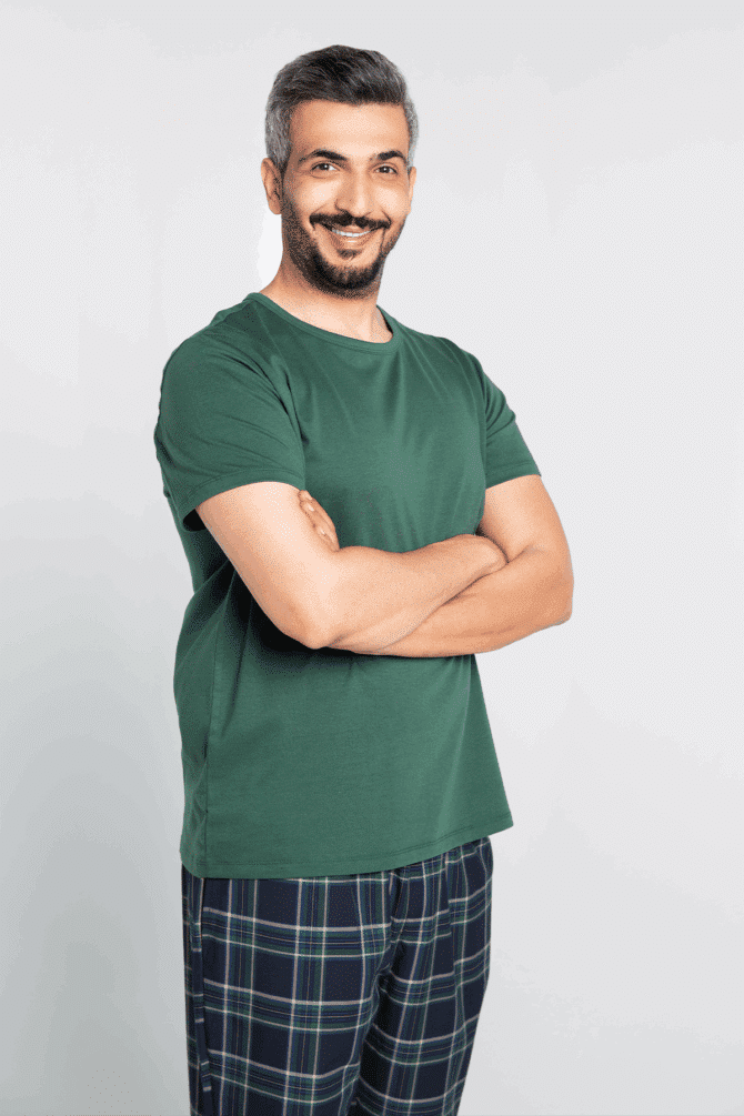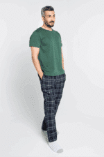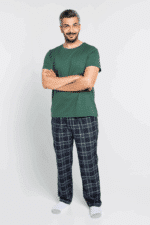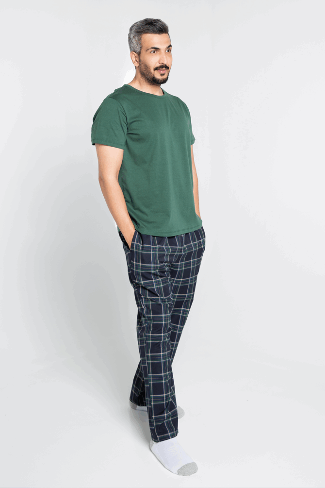 طقم مكون من قطعتين (سروال كاروهات وقميص أخضر بقصة دائرية) بتصميم بسيط وراقي يعكس ذوق الرجل العصري.