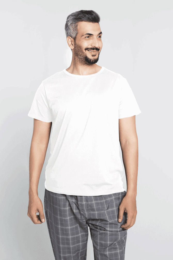 طقم مكون من قطعتين (سروال مقلم وقميص بيج بقصة دائرية) بتصميم بسيط وراقي يعكس ذوق الرجل العصري.