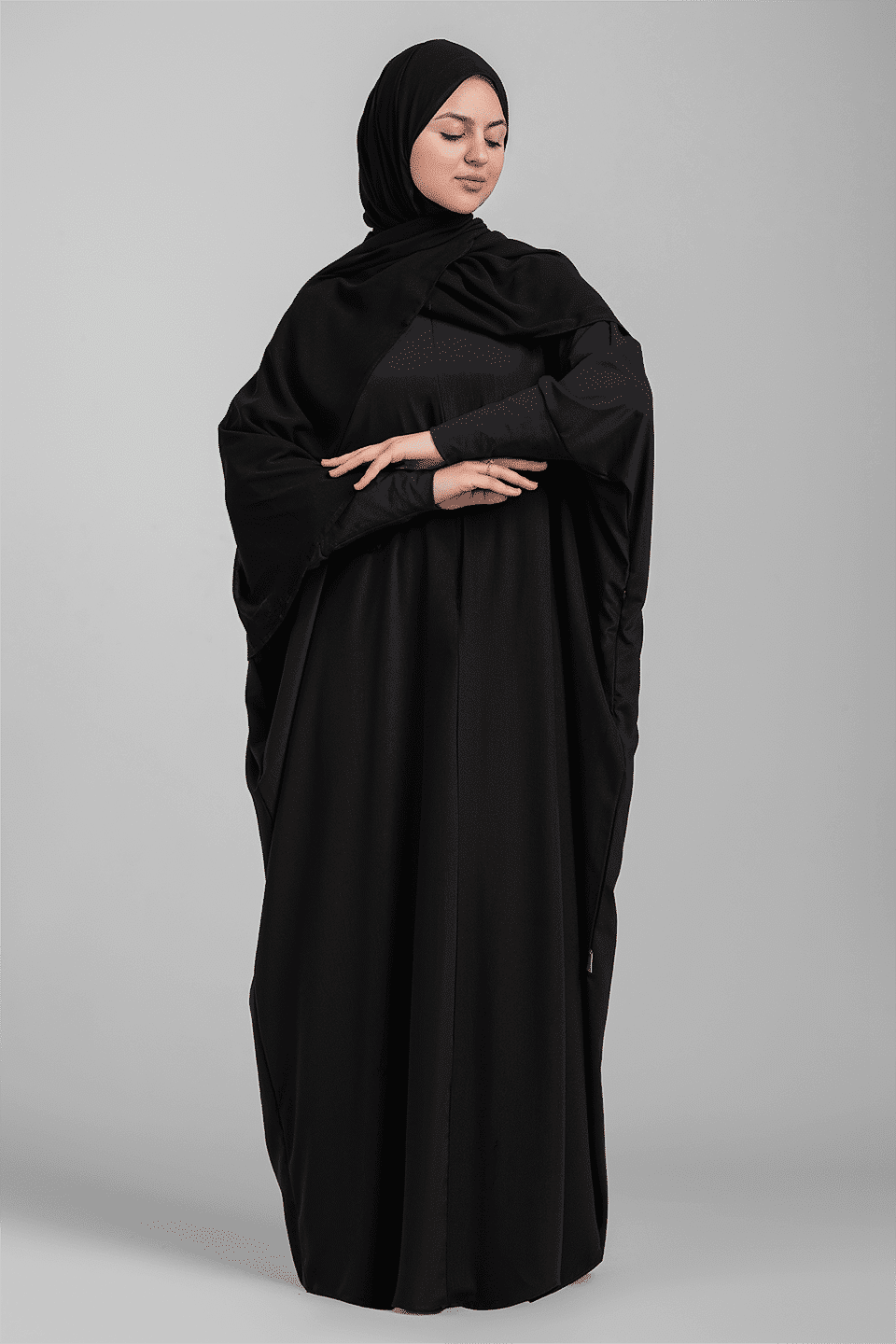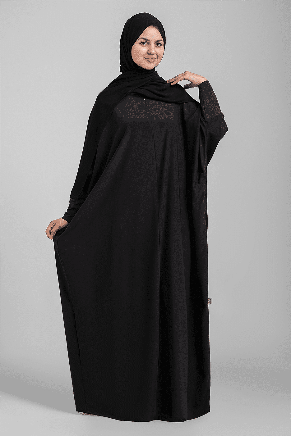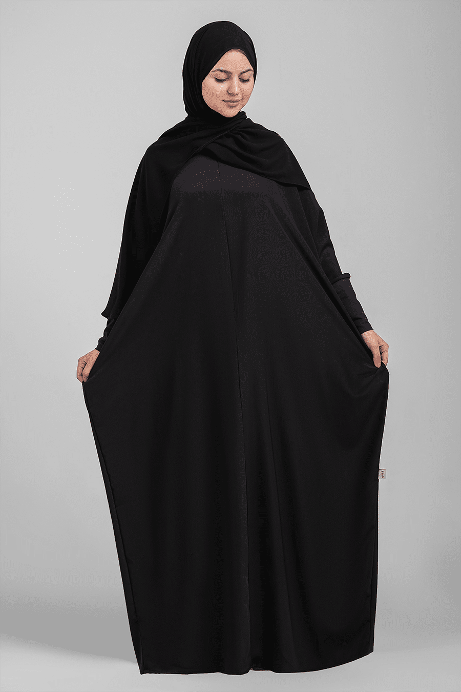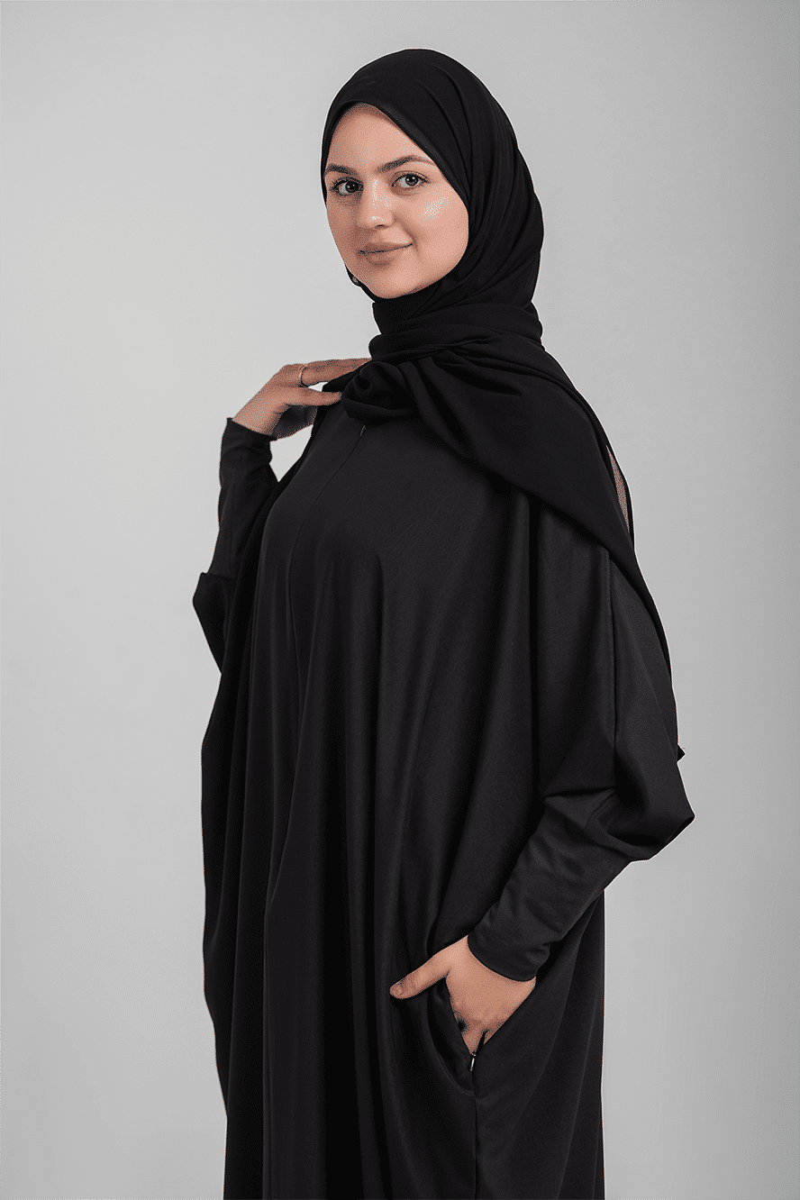 This lightweight abaya features a front zipper, flexible sleeves for ablution, and a zippered pocket. It includes two matching scarves: one cotton and one sheer.