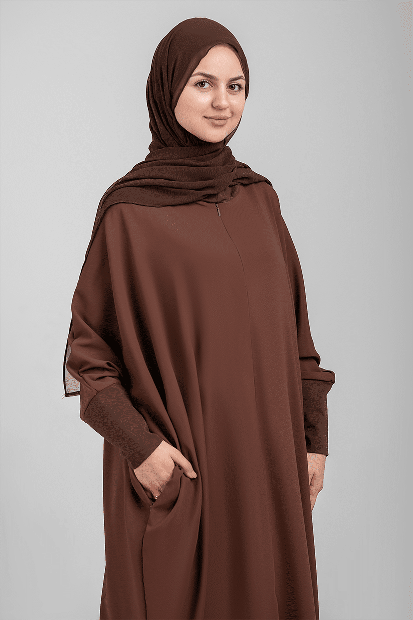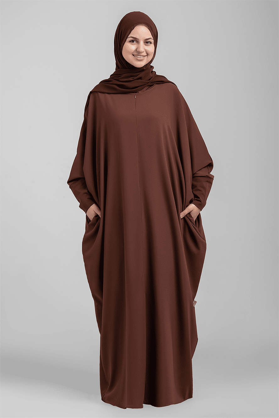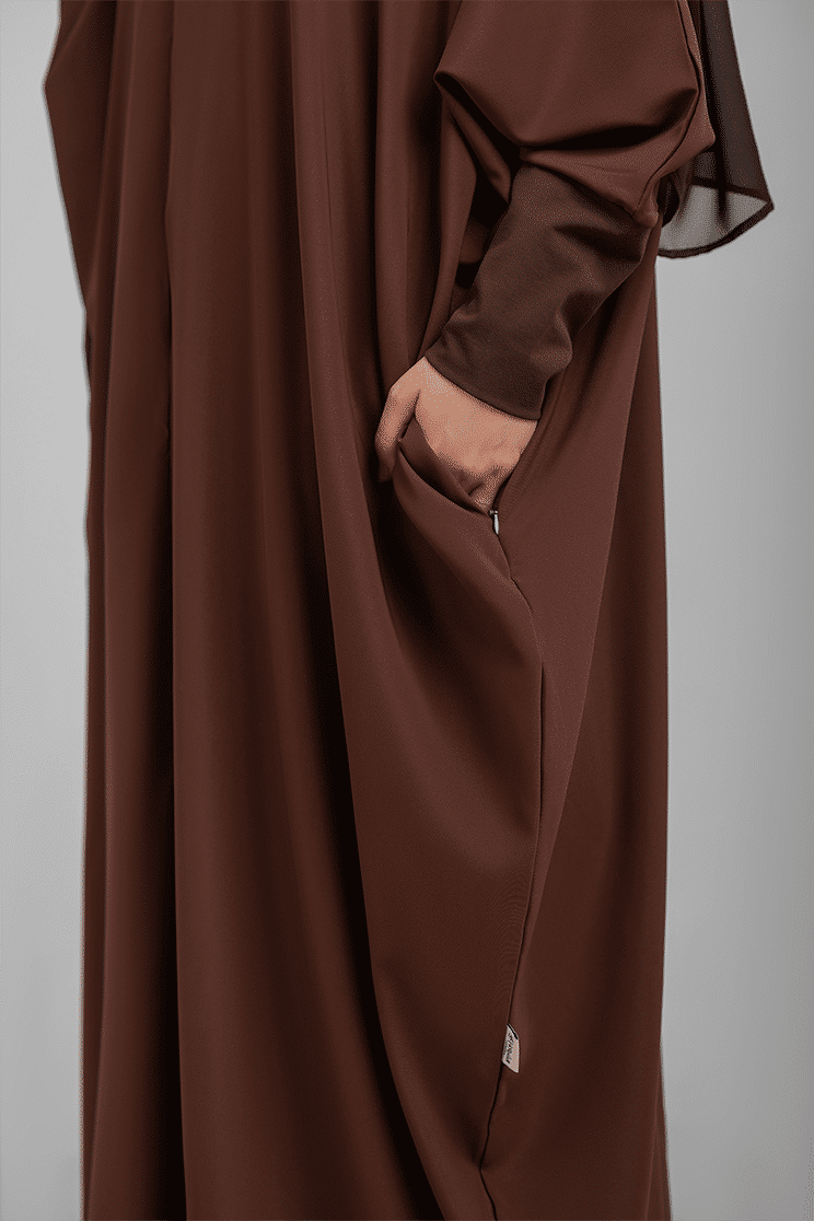 This lightweight abaya features a front zipper, flexible sleeves for ablution, and a zippered pocket. It includes two matching scarves: one cotton and one sheer.