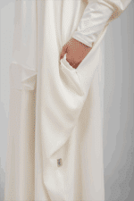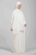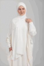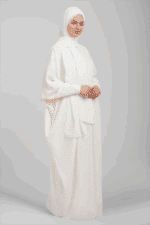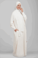 This lightweight abaya features a front zipper, flexible sleeves for ablution, and a zippered pocket. It includes two matching scarves: one cotton and one sheer.