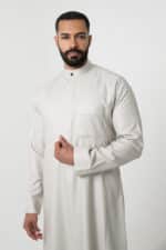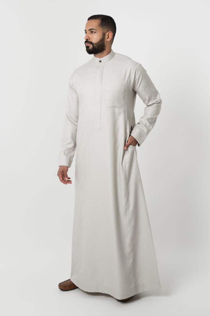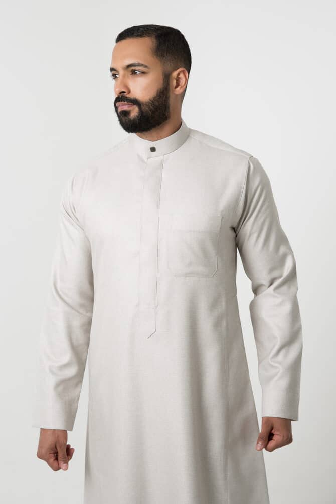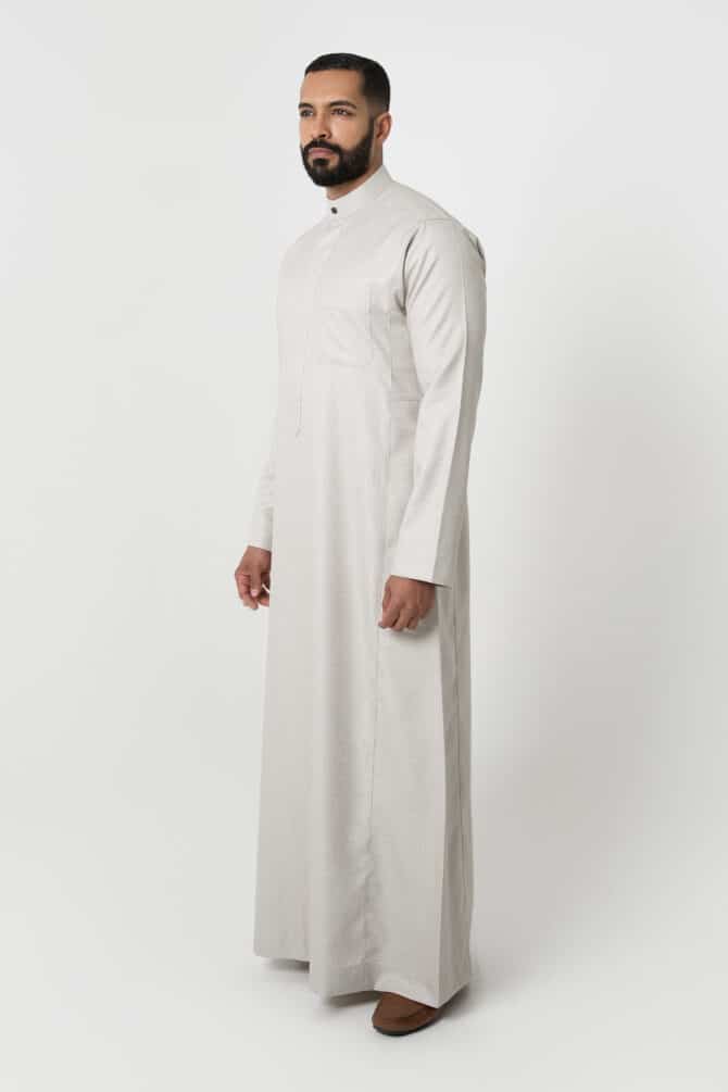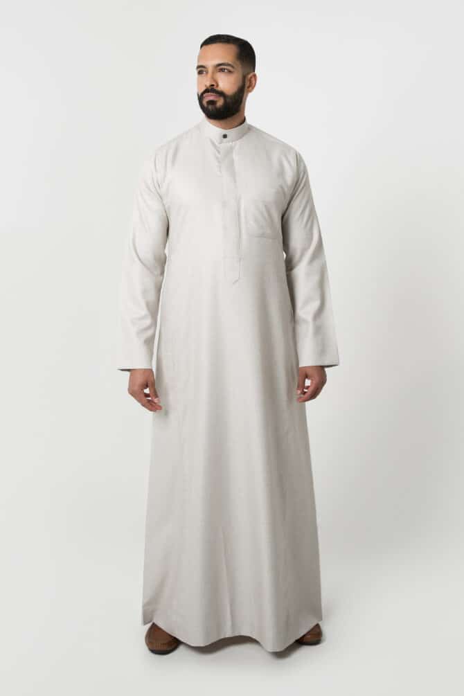 Stay stylish this winter with the Alshiaka business thobe for men in elegant ivory.