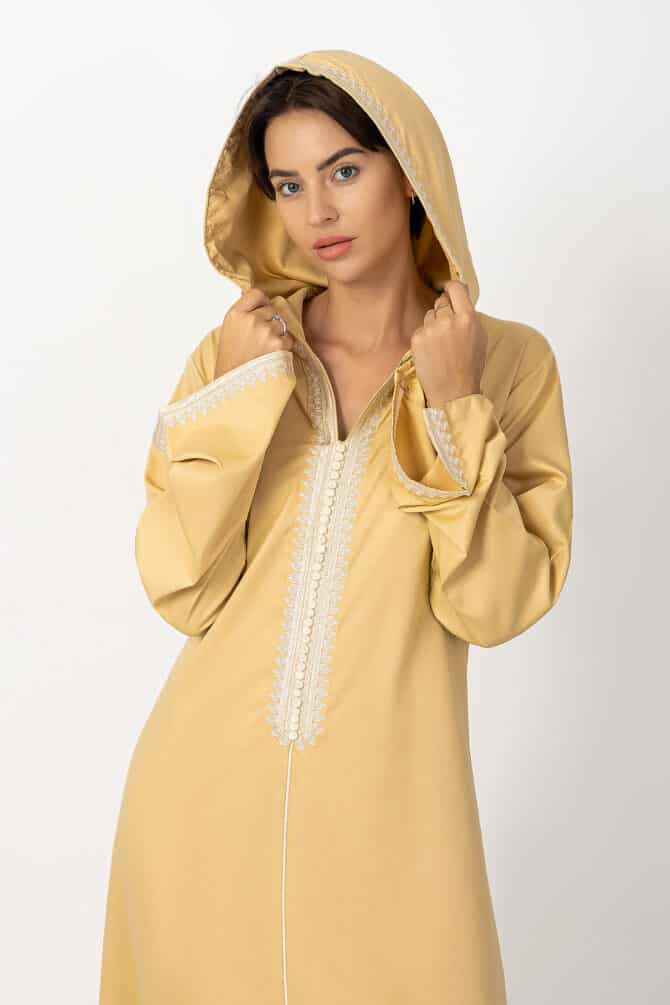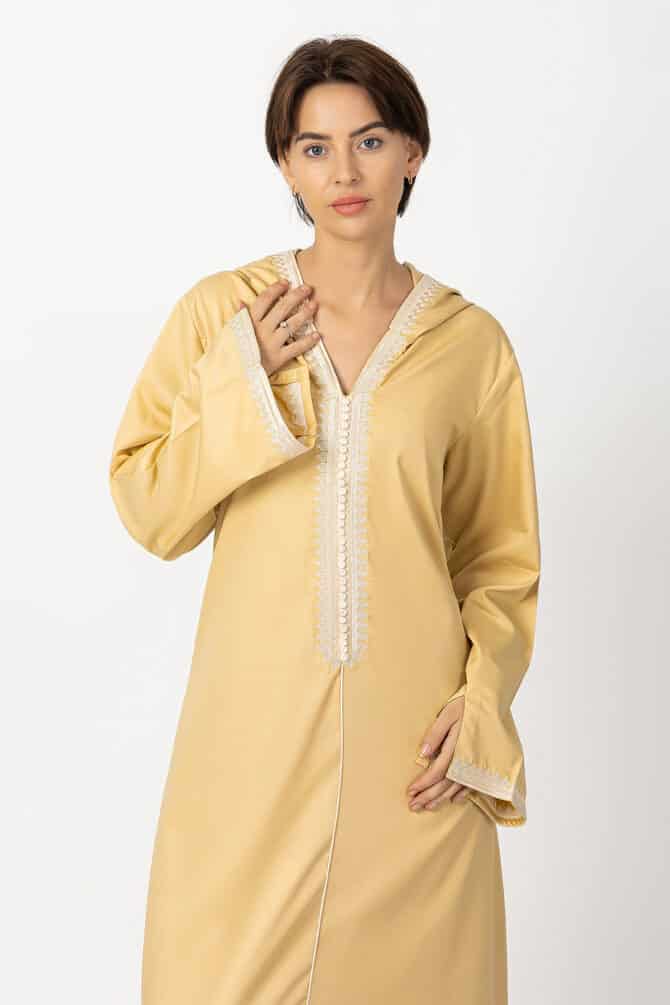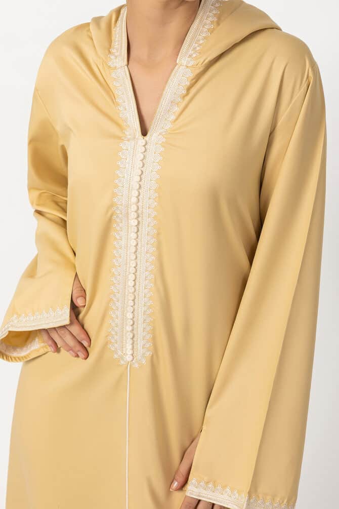 This Beige jalabiya, made from soft cotton, features beautiful intricate embroidery.