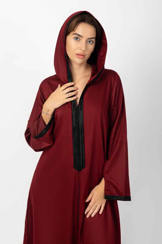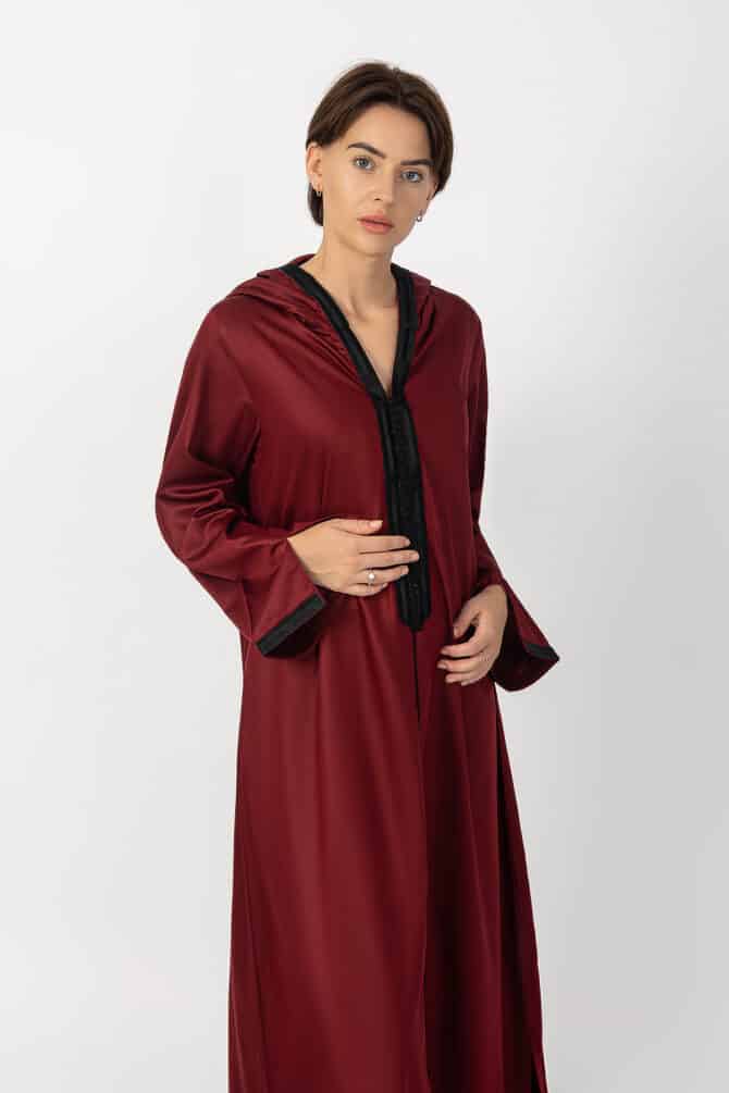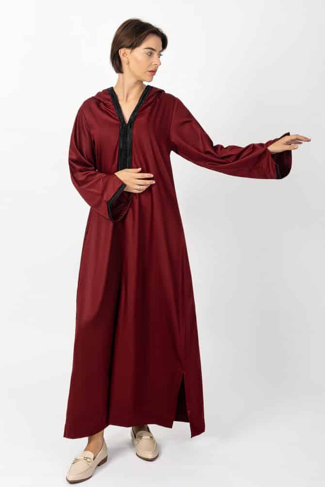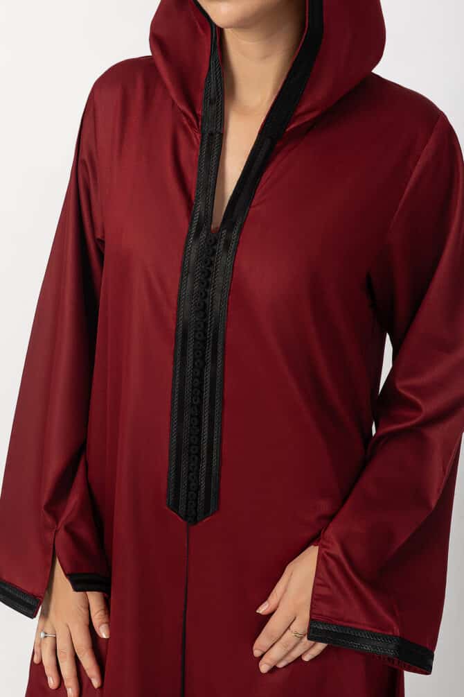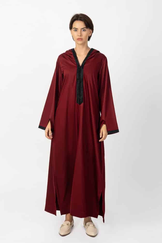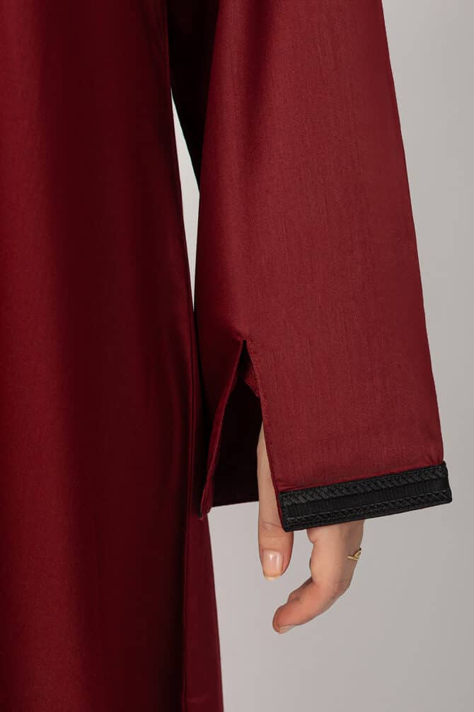This Burgundy jalabiya, made from soft cotton, features beautiful intricate embroidery.