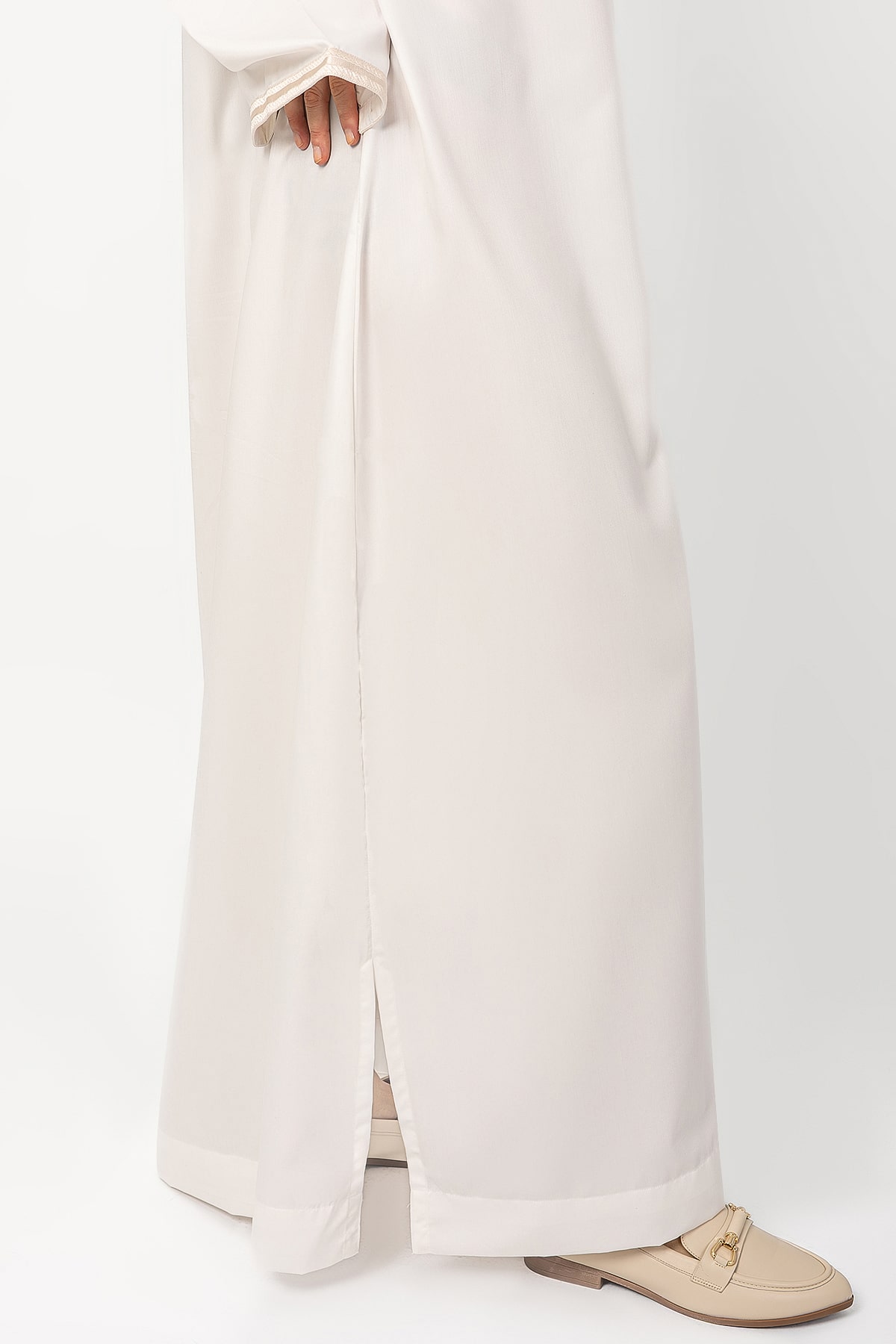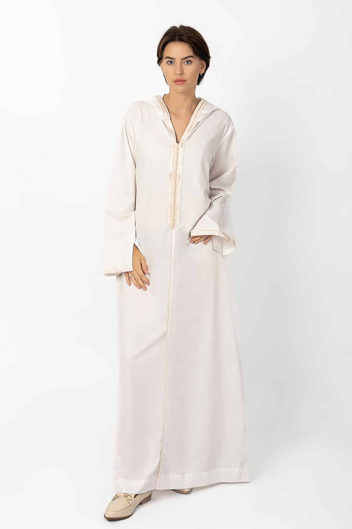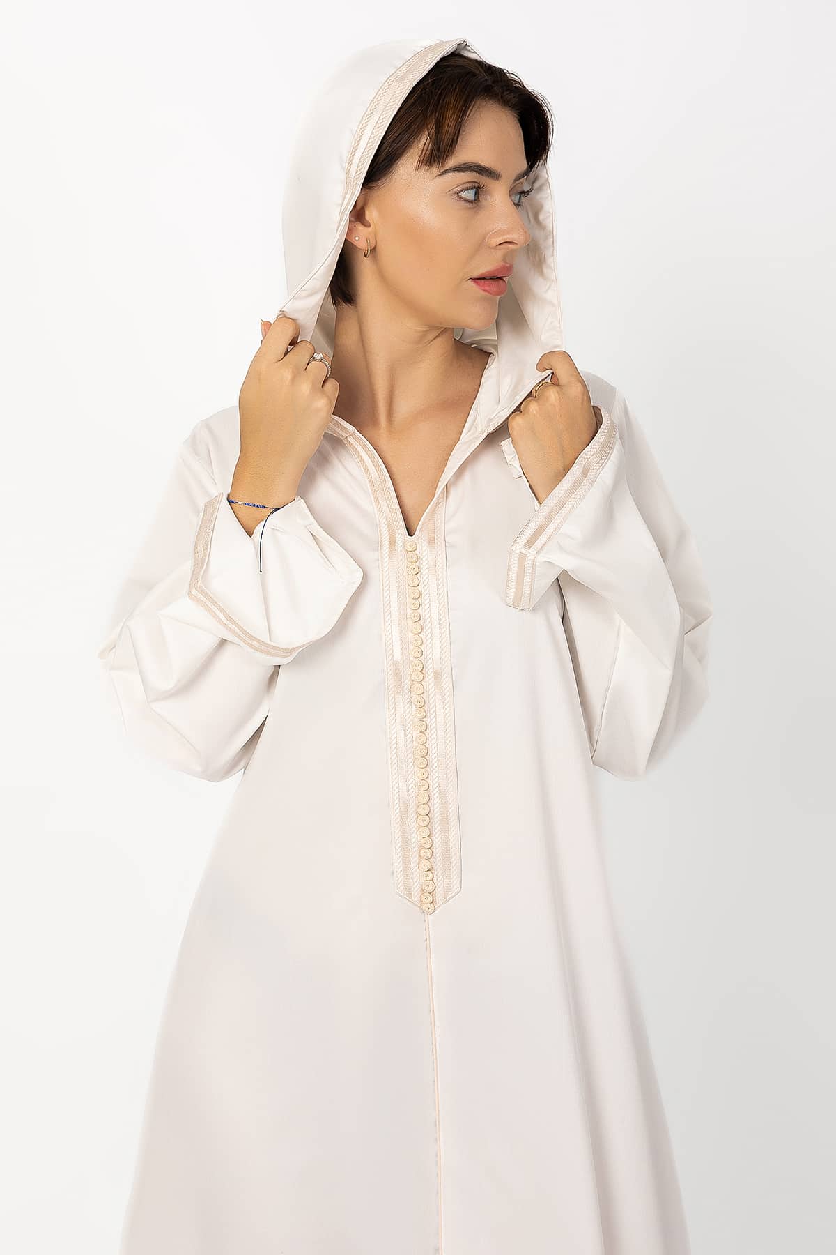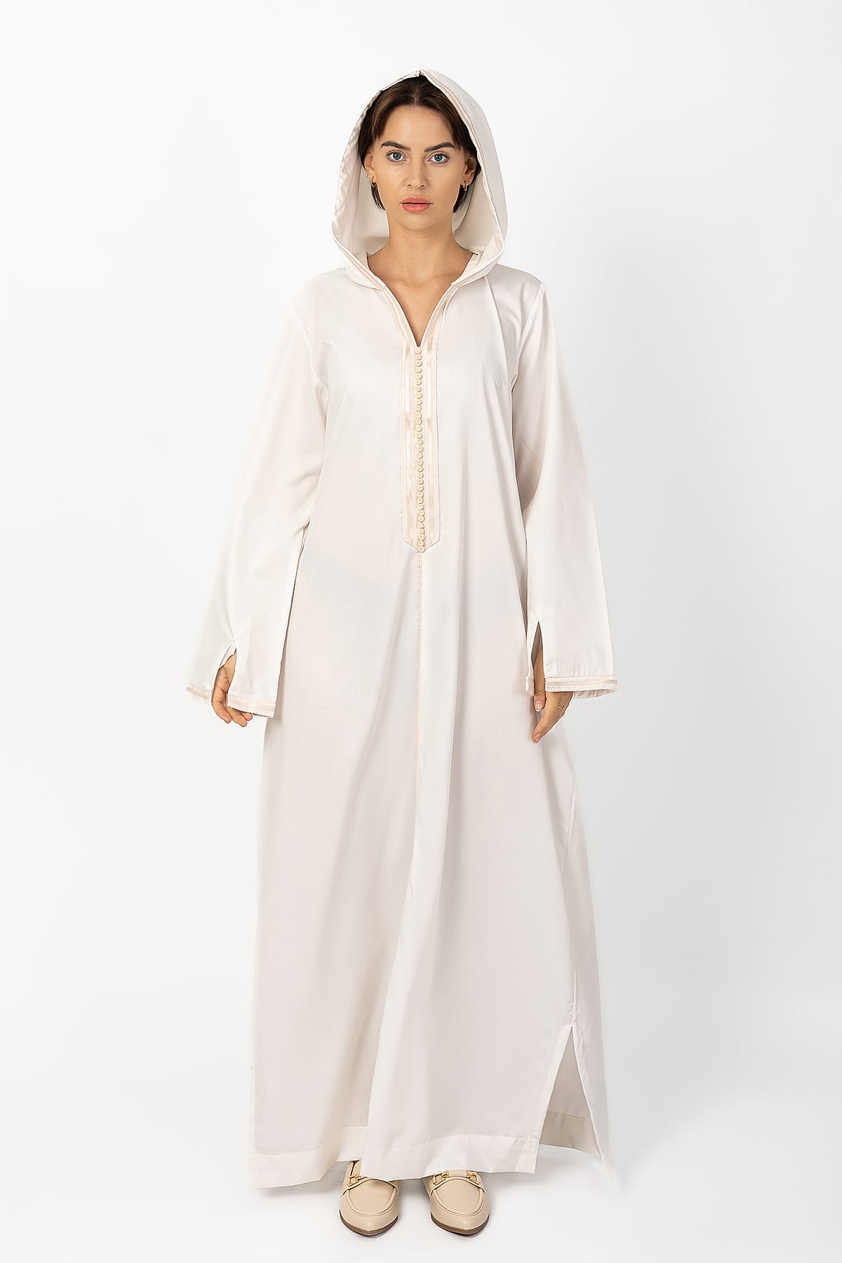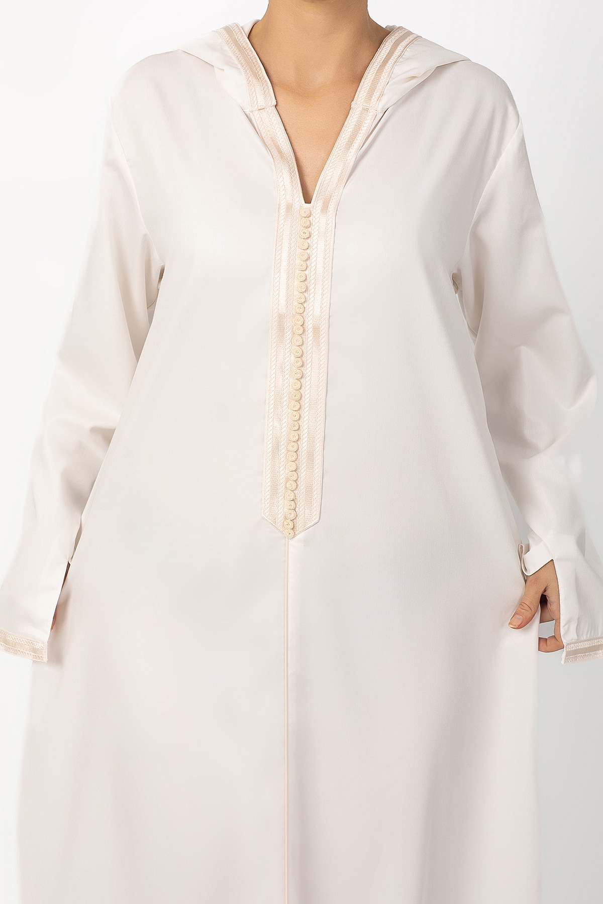 This cream jalabiya, made from soft cotton, features beautiful intricate embroidery.