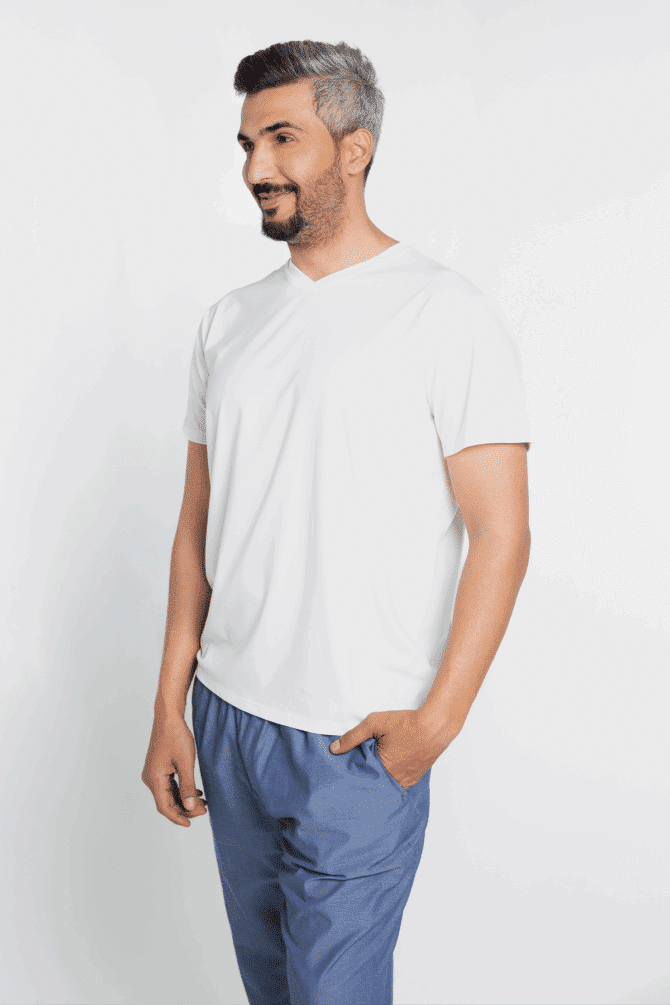 Modern & Stylish: A two-piece set (Plain pants and a white V-neck T shirt) for a sophisticated look.