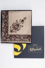 Men’s Kashmiri Shemagh in beige with brown patterns. This warm and elegant winter design is perfect for Saudi gentlemen during the seasonal months.