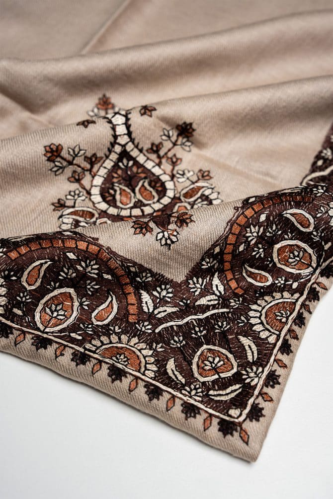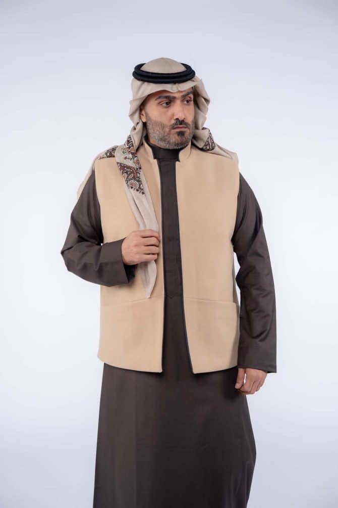 Men’s Kashmiri Shemagh in beige with brown patterns. This warm and elegant winter design is perfect for Saudi gentlemen during the seasonal months.