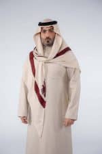 Men’s Kashmiri Shemagh in beige with red patterns. This warm and elegant winter design is perfect for Saudi gentlemen during the seasonal months.