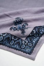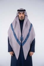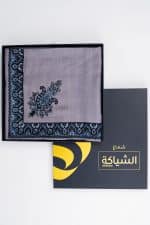 Men’s Kashmiri Shemagh in Grey with blue patterns. This warm and elegant winter design is perfect for Saudi gentlemen during the seasonal months.