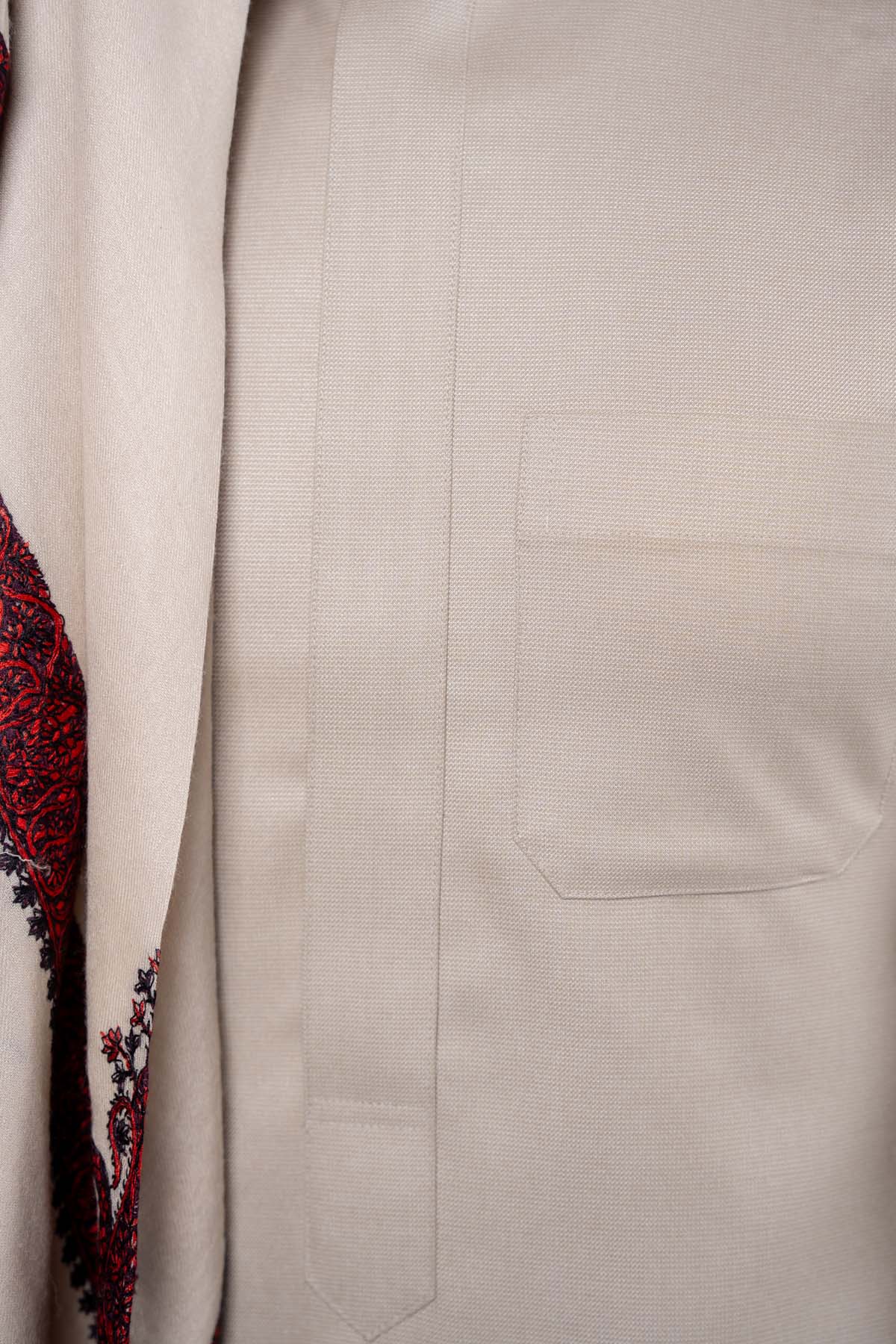 Stay warm and stylish this season with Al Shiaka’s elegant beige winter ReThobe. Featuring a plain collar and hidden zipper, it offers a modern look in a soft, wool-like fabric for lasting comfort and sophistication.
