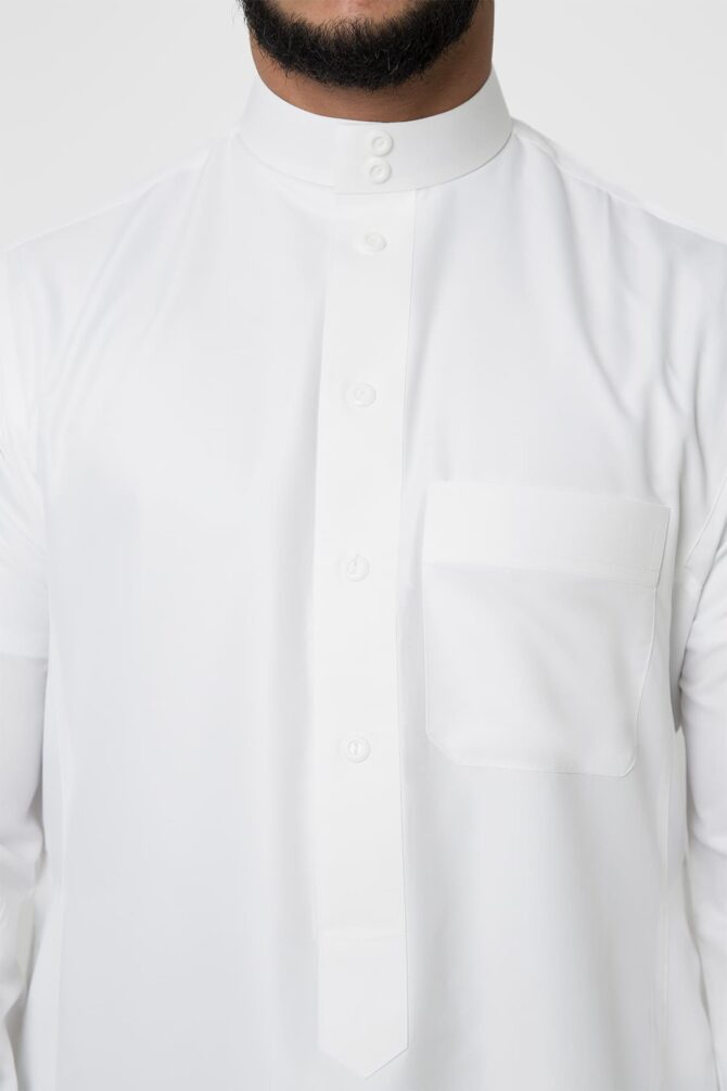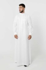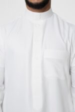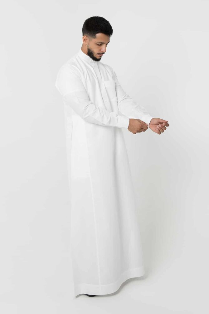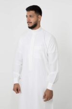Classic plain thobe made of 100% polyester fabric with Silk texture, lightweight, simple and elegant details, features a round collar, Triangle Placket Shape with front visible buttons, and tidy cuff sleeves.