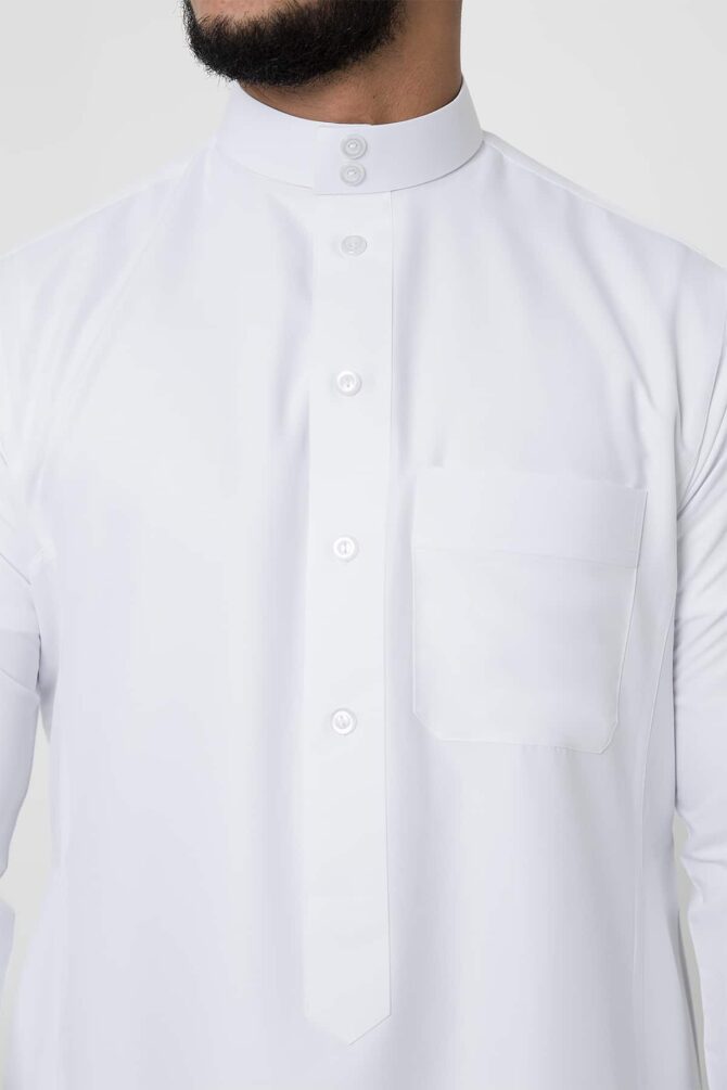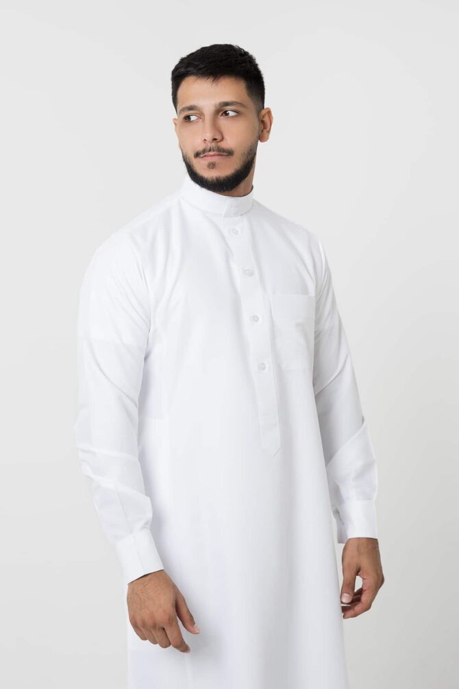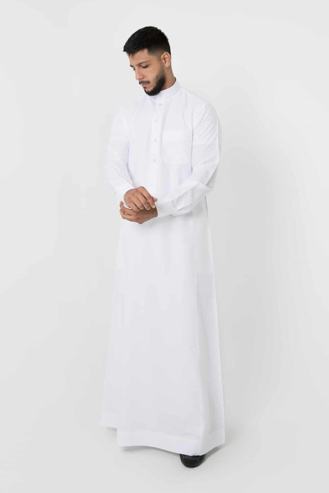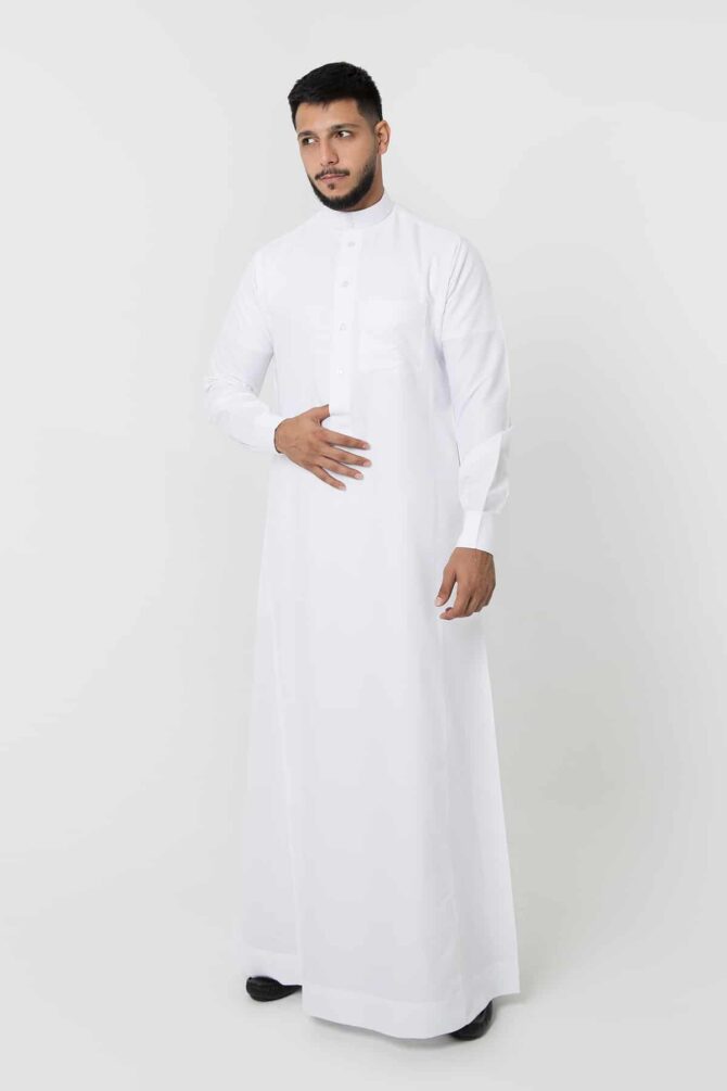 Classic plain thobe made of 100% polyester fabric with Silk texture, lightweight, simple and elegant details, features a round collar, Triangle Placket Shape with front visible buttons, and tidy cuff sleeves.