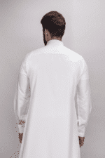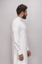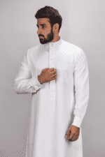 Classic plain thobe made of 100% polyester fabric with Silk texture, lightweight, simple and elegant details, features a round collar, Triangle Placket Shape with front visible buttons, and tidy cuff sleeves.