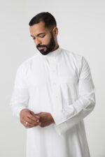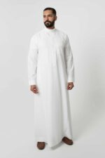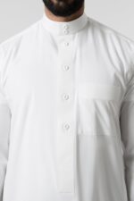 Classic plain thobe made of 100% polyester fabric with cotton texture, lightweight, simple and elegant details, features a round collar, Square Placket Shape with front visible buttons, and tidy plain sleeves.