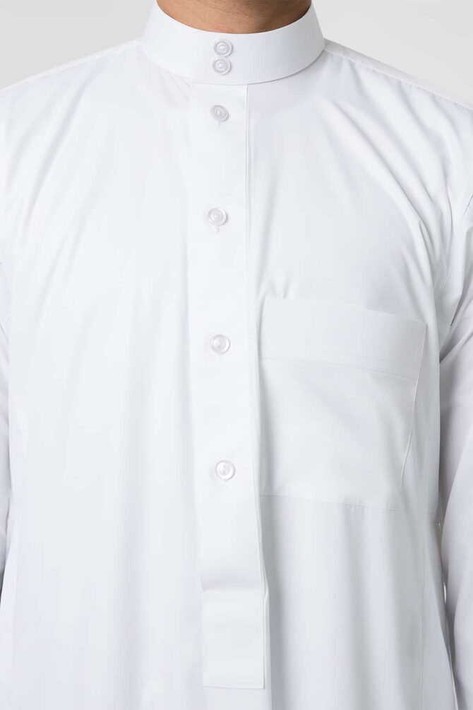 Classic plain thobe made of 100% polyester fabric with cotton texture, lightweight, simple and elegant details, features a round collar, Square Placket Shape with front visible buttons, and tidy plain sleeves.