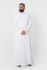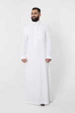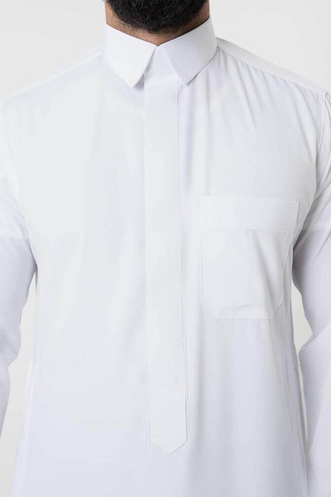 - Thobe Fakher Silk is a luxurious white thobe made from the finest Korean Fabric, anti-static fabric, woven with luxury, befitting the elegance of your presence at your special events and happy holidays, a thobe with a round collar and square placket shape with Hidden Zipper, to complement its elegance with tidy plain sleeves.