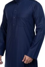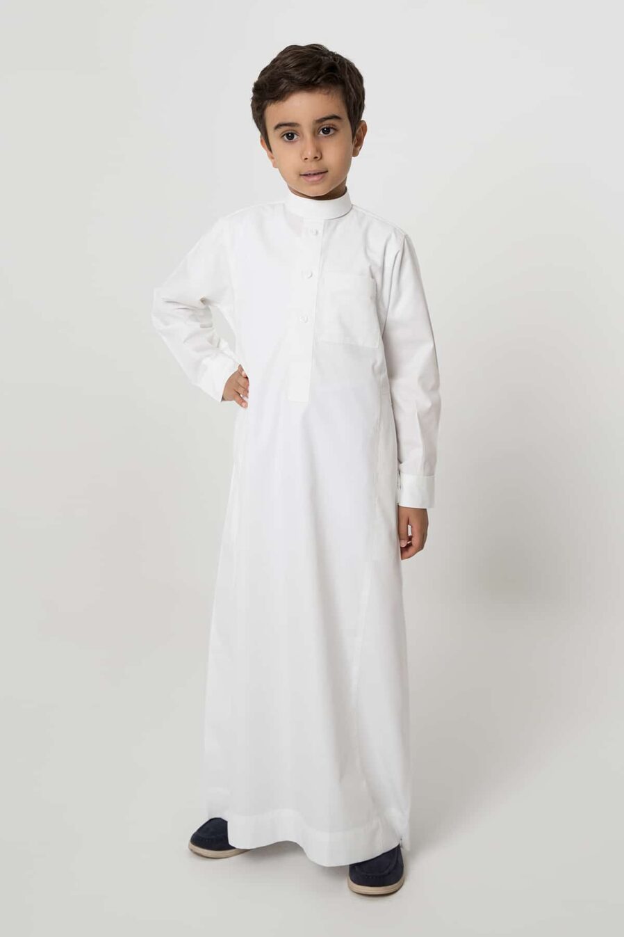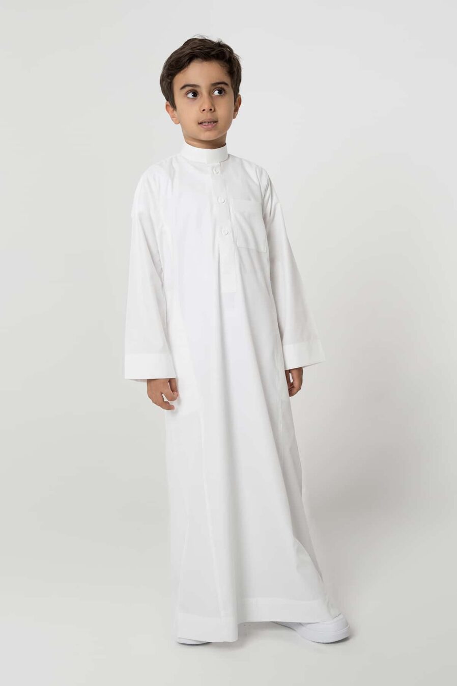 Summer classic plain thobe made of 100% polyester fabric with Silk texture, lightweight, simple and elegant details, features a round collar, Triangle Placket Shape with front visible buttons, and tidy plain sleeves.