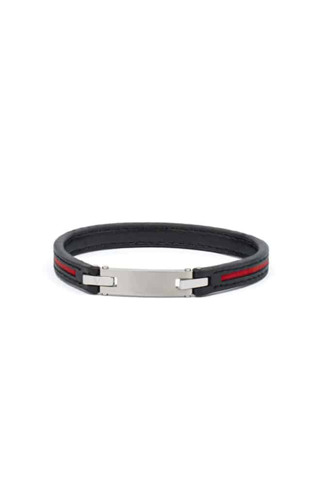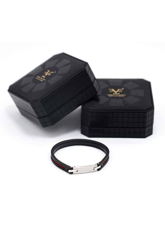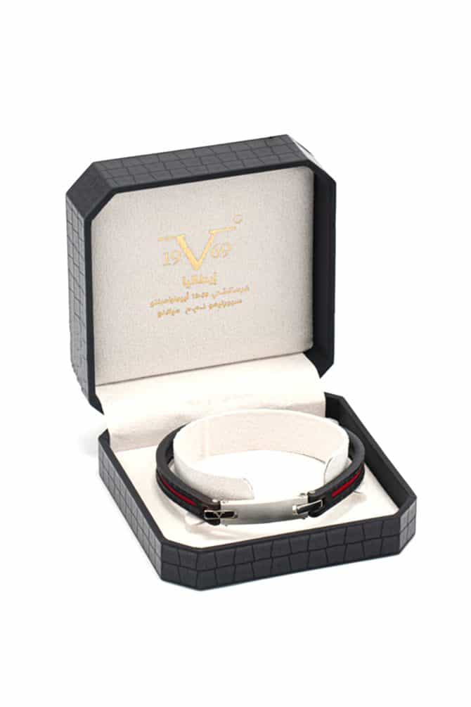 A men’s Versace bracelet crafted from stainless steel with black leather and a bold red accent. A limited edition piece that’s elegant, unique, and perfect for gifting.