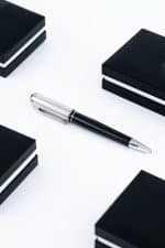 A refined silver and black metal pen with smooth blue ink, blending elegance and function. Designed to complement the Saudi thobe, it adds a distinguished touch to every look.