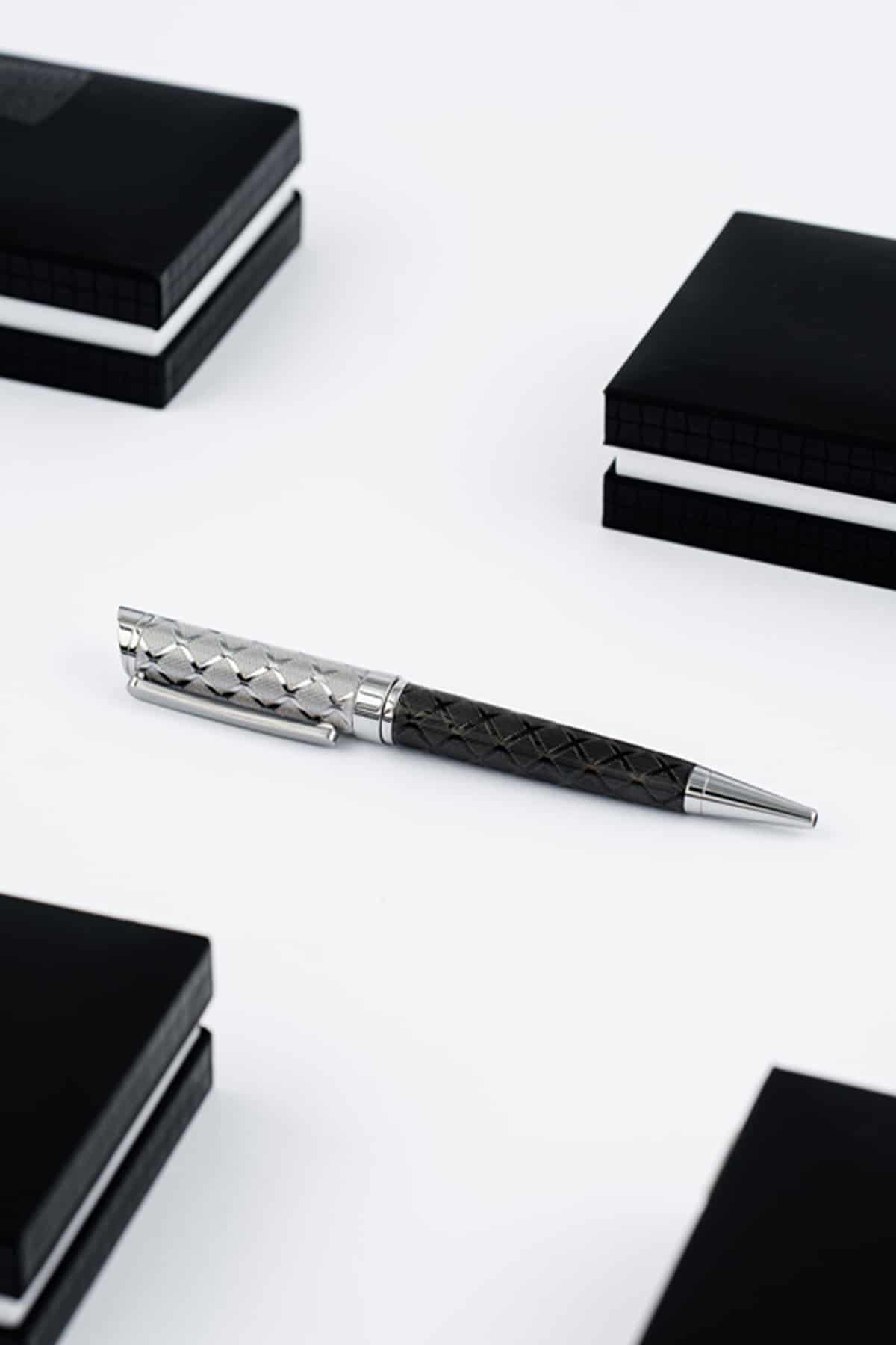 A luxurious metallic pen with elegant engraved details, combining silver and black for a refined look. Designed for smooth, effortless writing — the perfect accessory to complement the Saudi thobe with sophistication and distinction.