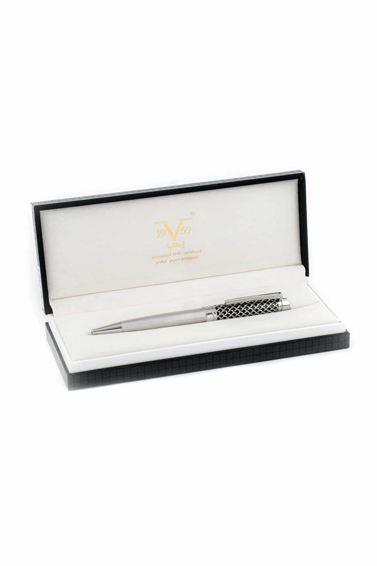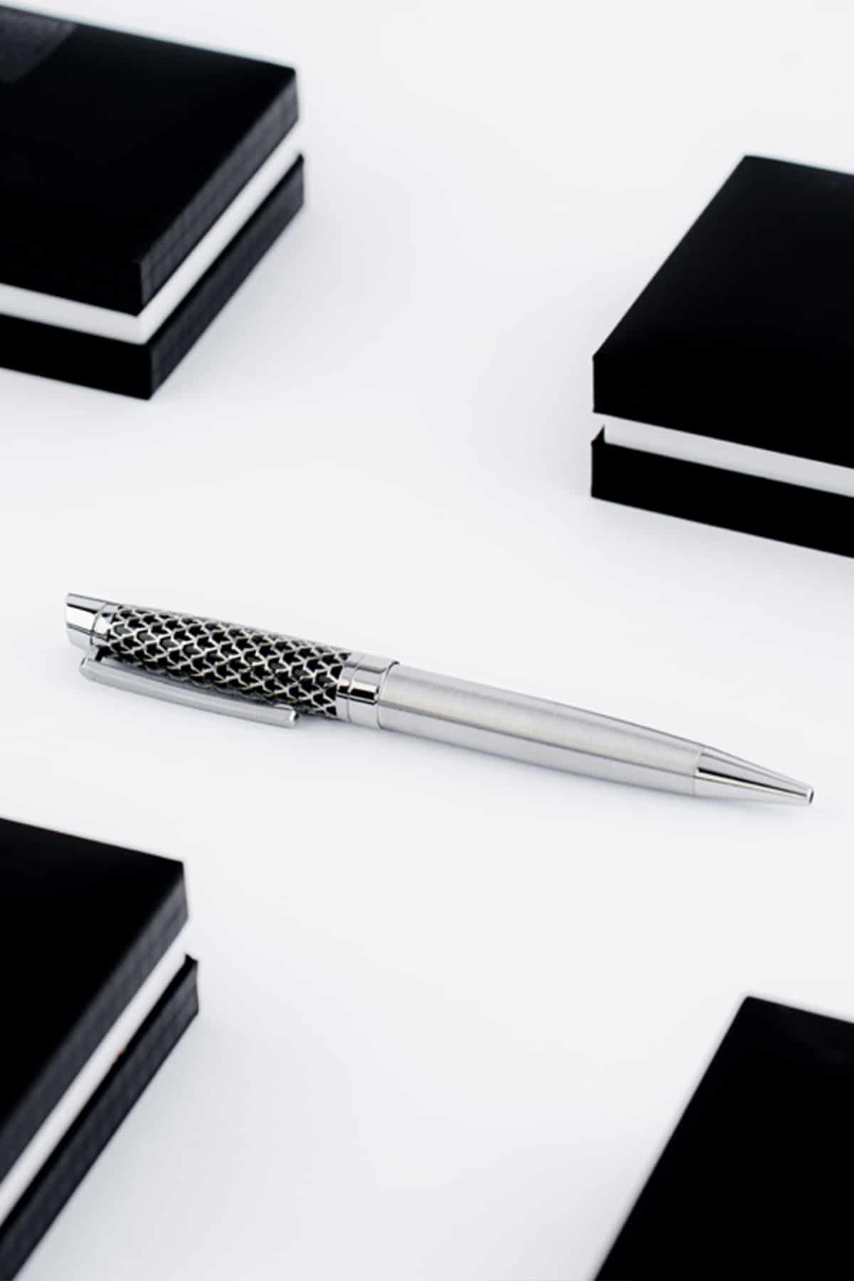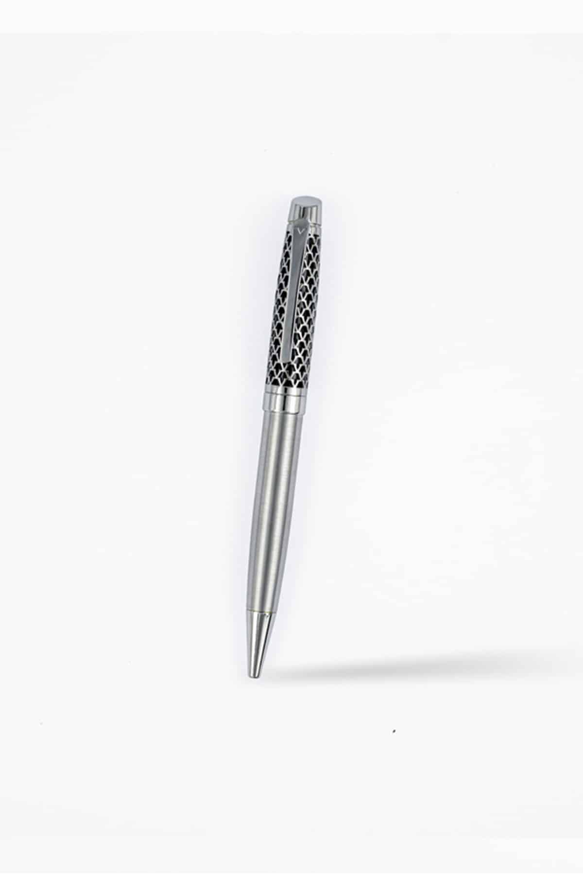 A refined silver-toned metallic pen with elegant engraved details, designed for smooth blue ink writing. Perfectly suited for the Saudi thobe, this accessory adds a touch of class and distinction to every look.