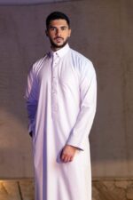 كن مميزاً إينما ذهبت بثوب “ري ثوب” عصري مصنوع من قماش بوليستر 100% تتفوق تصاميم حياكته على جميع توقعاتك, يتميز بياقة قلاب أنيقة مبطنة , جبزور مربع الشكل بسحاب مخفي مزين بأزرار معدنية , أكمام سادة مبطنة