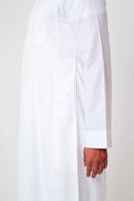 ثوب كلاسيك سادة سحاب مخفي, لون أبيض, مصنوع من قماش بوليستر 100% بملمس قطني, ثوب خفيف الوزن يتميز ببساطة تفاصيله الأنيقة بياقة دائرية,جبزور مثلث الشكل و سحاب أمامي مخفي, أكمام سادة.
